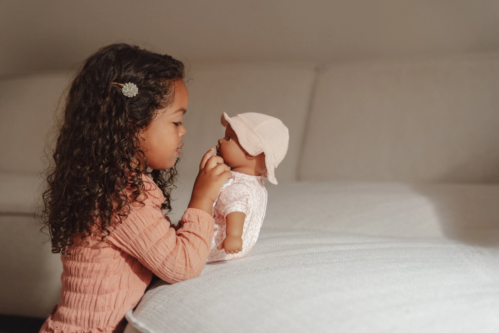This delightful ensemble is perfect for any occasion. Enjoy dressing up your favourite doll for a day filled with playtime adventures. The set features a precious short-sleeved one-piece suit in a soft and enchanting shade of pink, adorned with lovely little flowers & sweet pale pink sun hat (2-piece set).