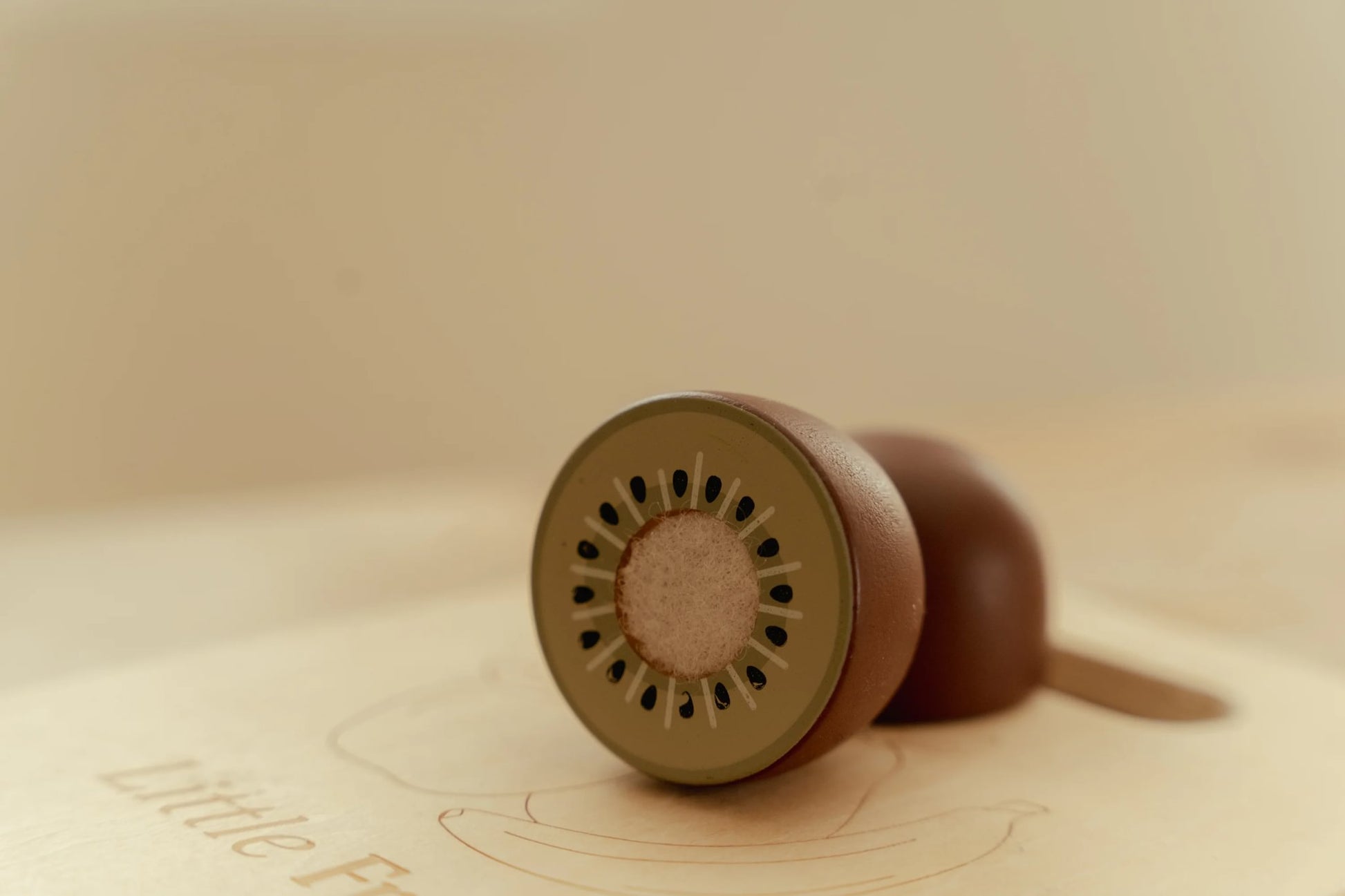 A cutting board and wooden knife are included to divide the fruits in half and reveal the inside. What's your favourite? Apple, banana, kiwi fruit, pear, orange or a slice of water melon? (Have your pick!)