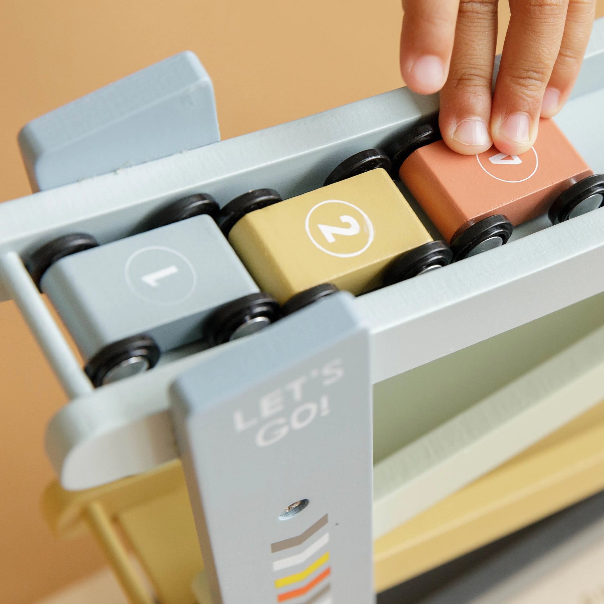 1, 2, 3, race away! With this cheerful wooden race track including 4 cars, your little one will have a great time. Place the cars one by one at the top of the race track, let them go, and they race down.