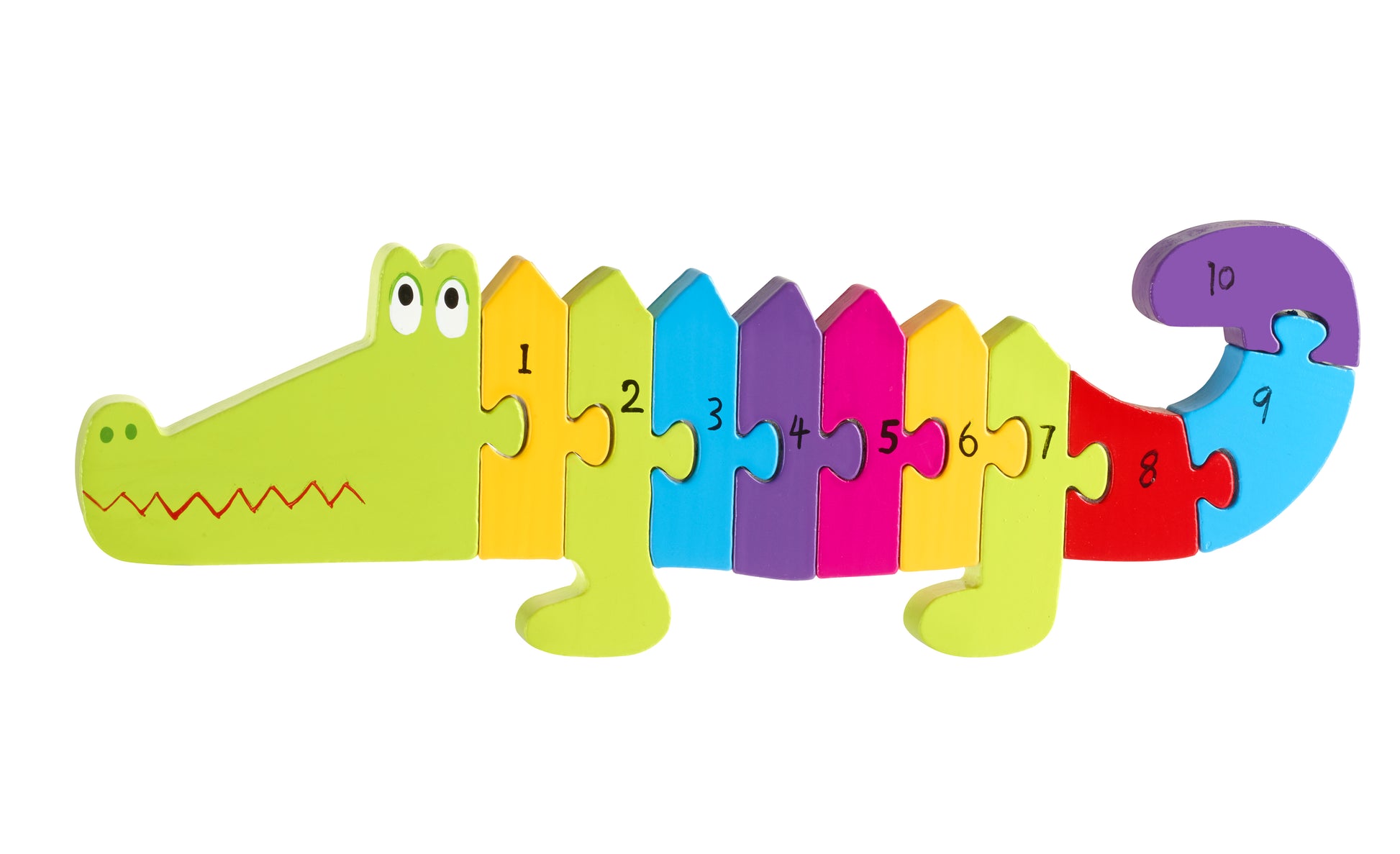 Introduce little ones to the numbers 1- 10, with this fun 11 piece wooden jigsaw puzzle in the shape of a Crocodile.