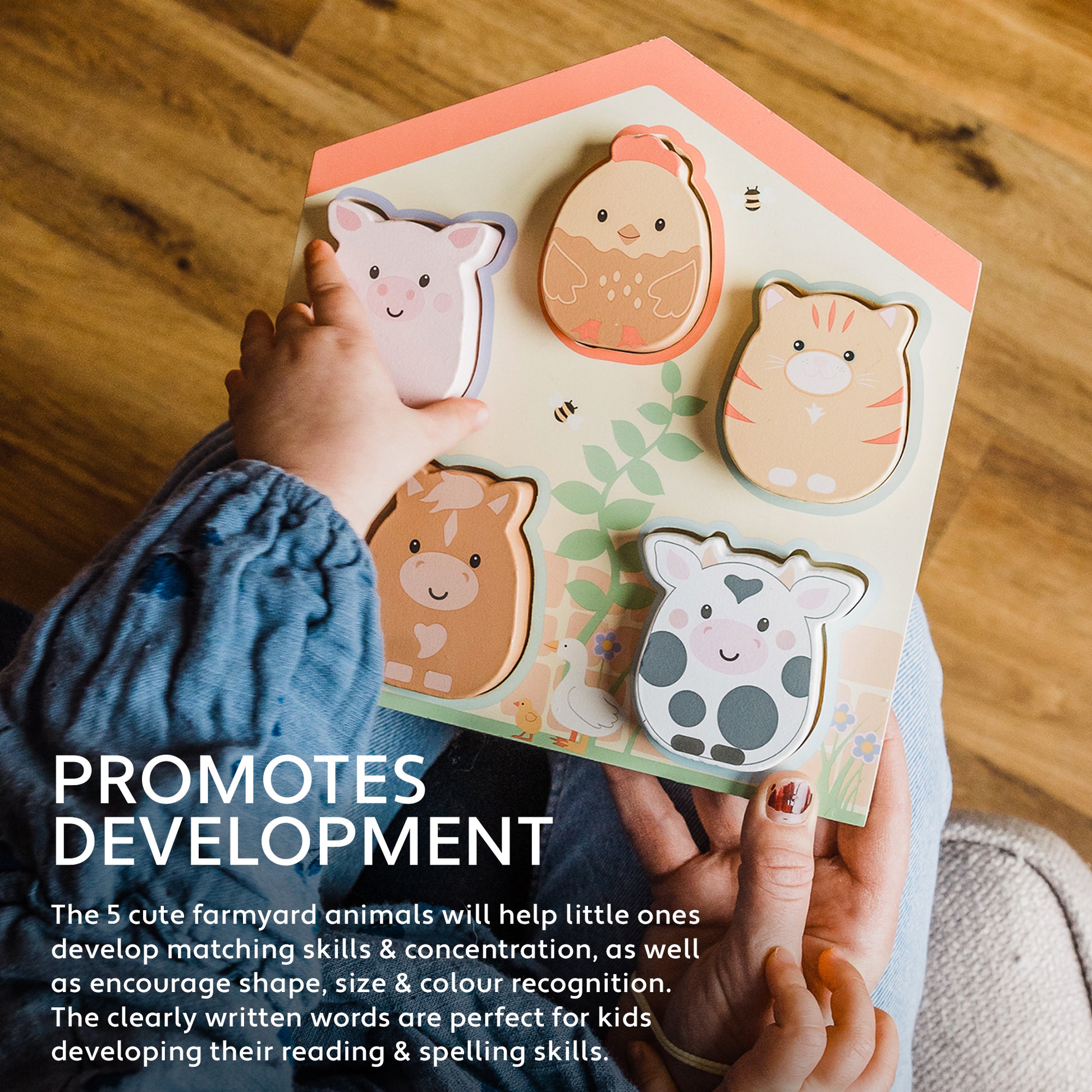 The 5 cute farmyard animals will help little ones develop matching skills & concentration, as well as encourage shape, size & colour recognition. The clearly written words are perfect for kids developing their reading & spelling skills. The puzzle is made entirely from FSC®-certified wood, and comes in fully recyclable packaging.