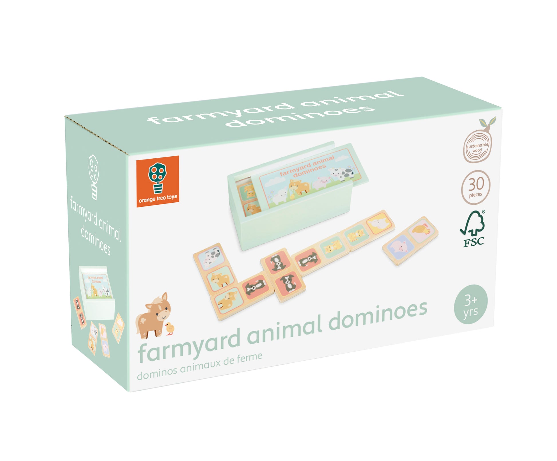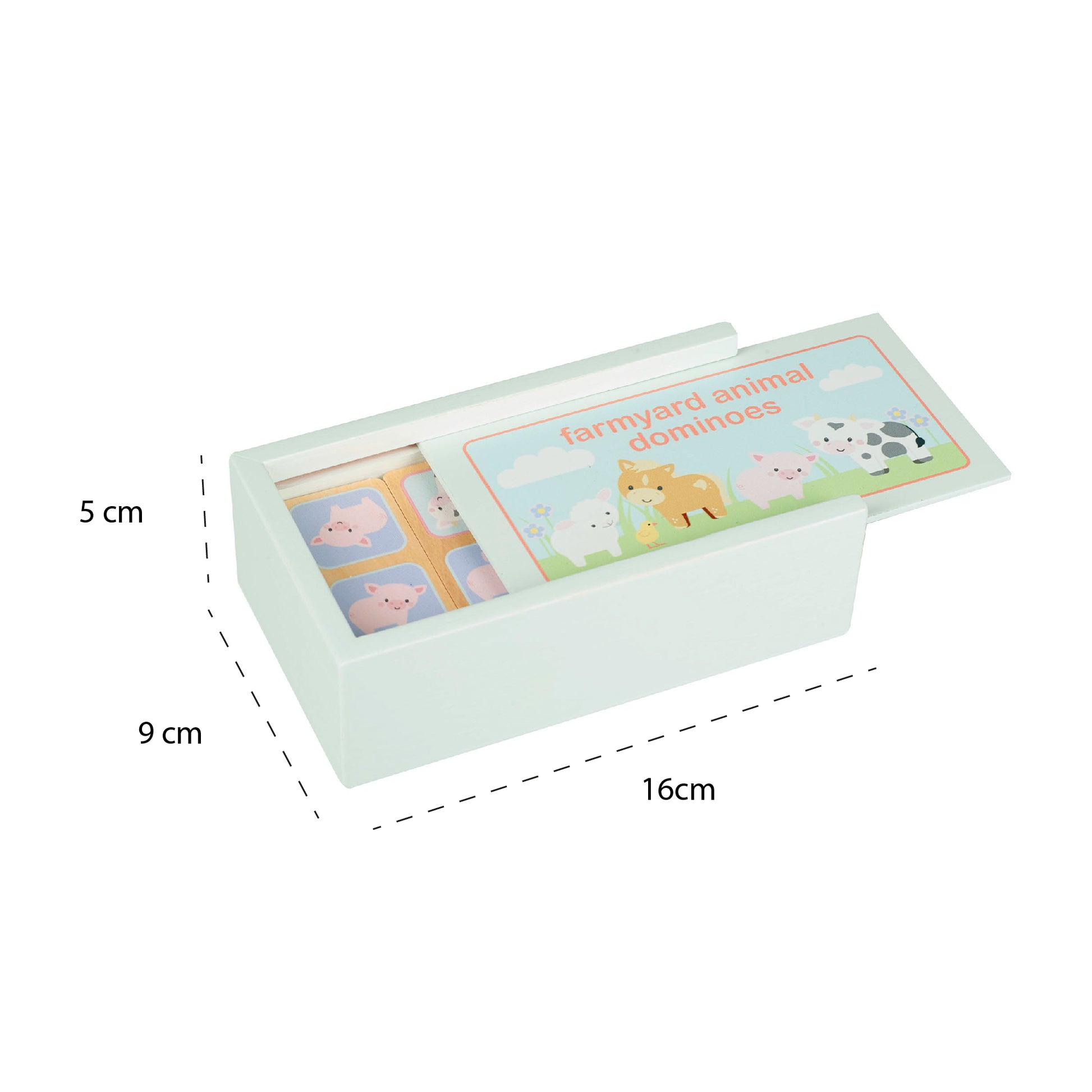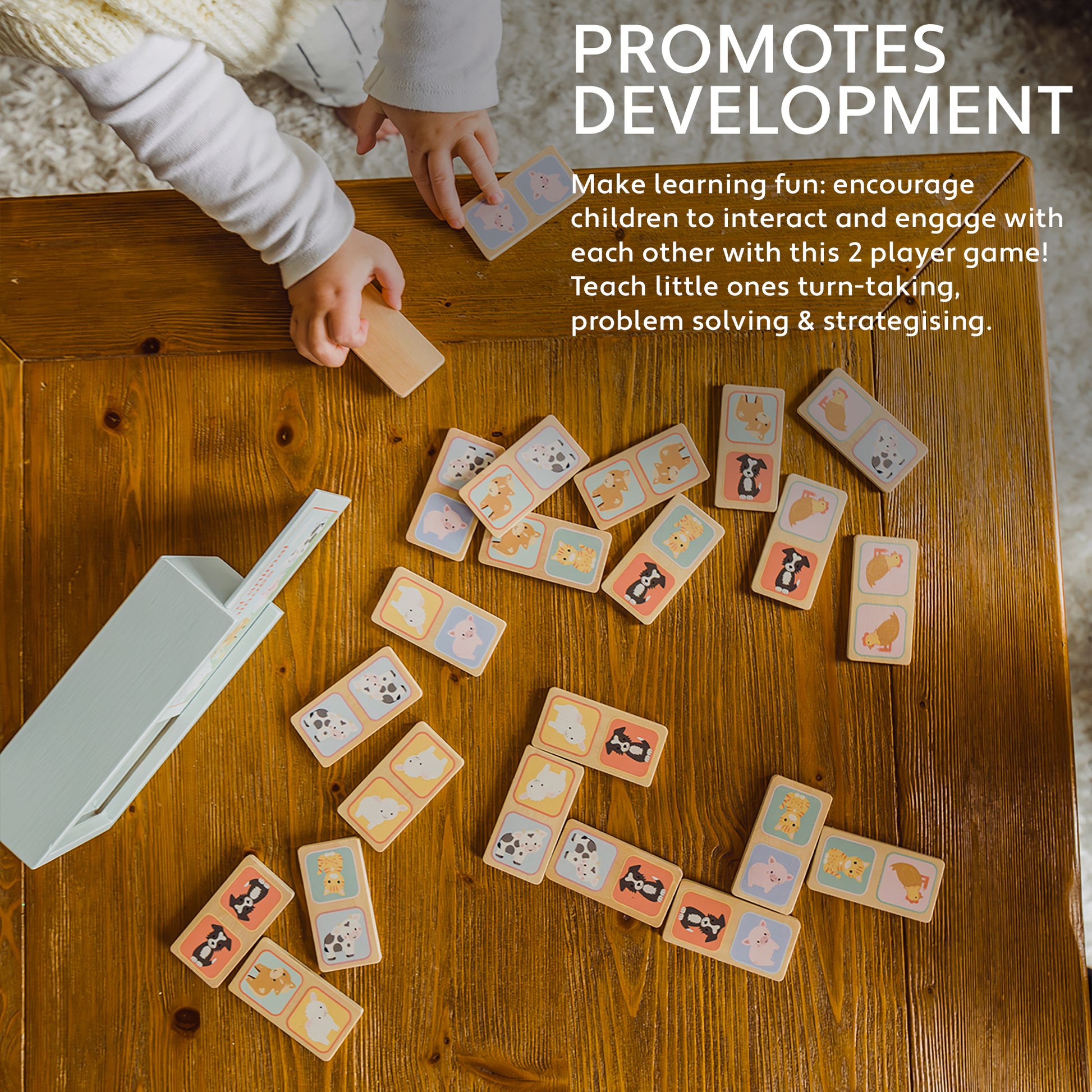 A beautiful set of 28 wooden dominoes, each with a different combination of colourful farmyard animals.
