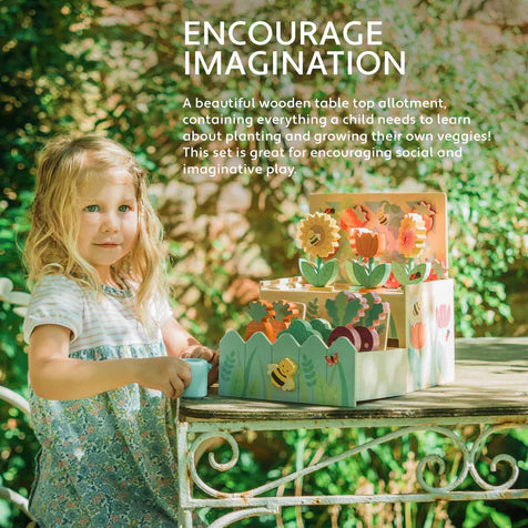 A beautiful wooden table top allotment, containing everything a child needs to learn about planting and growing their own veggies! This set is great for encouraging social and imaginative play.