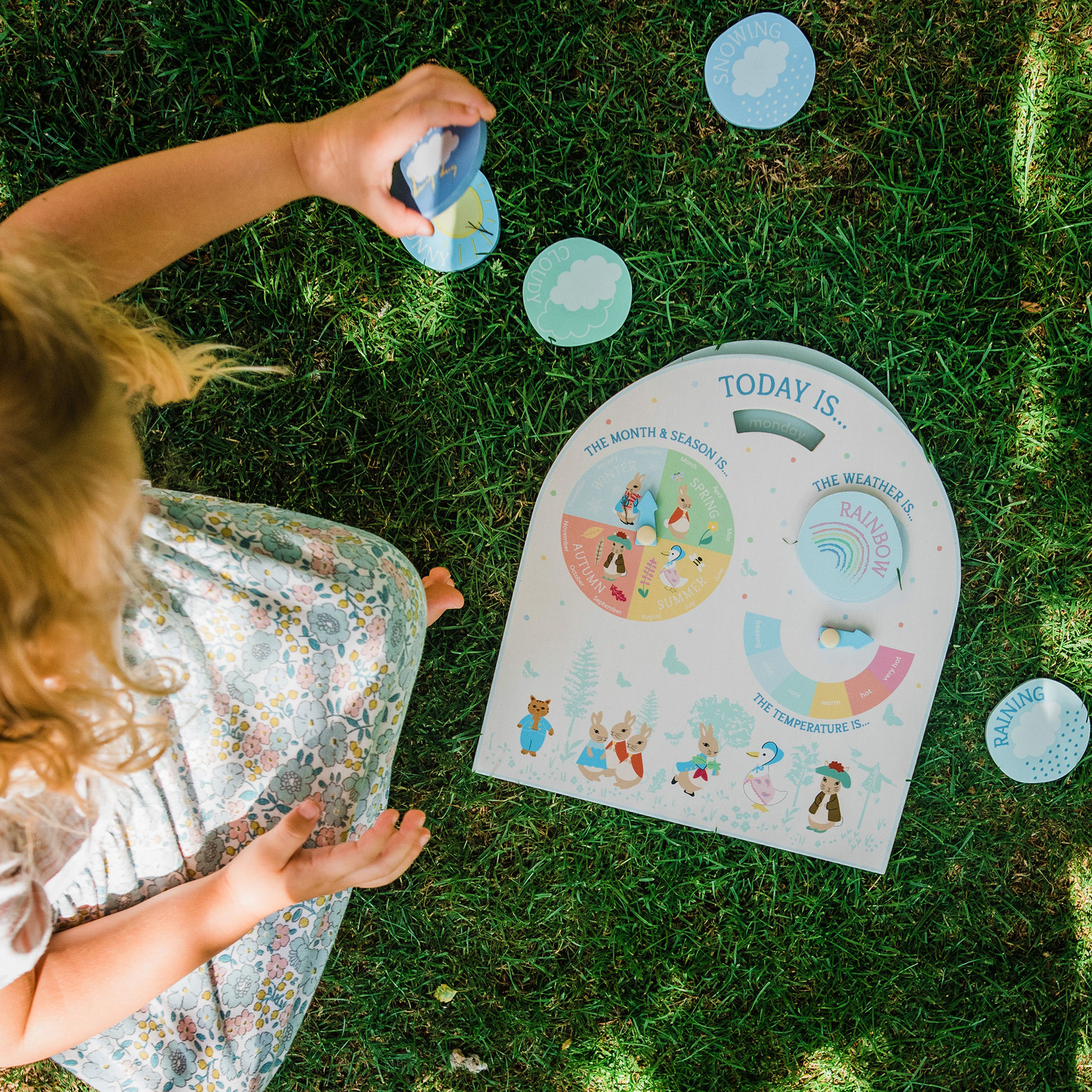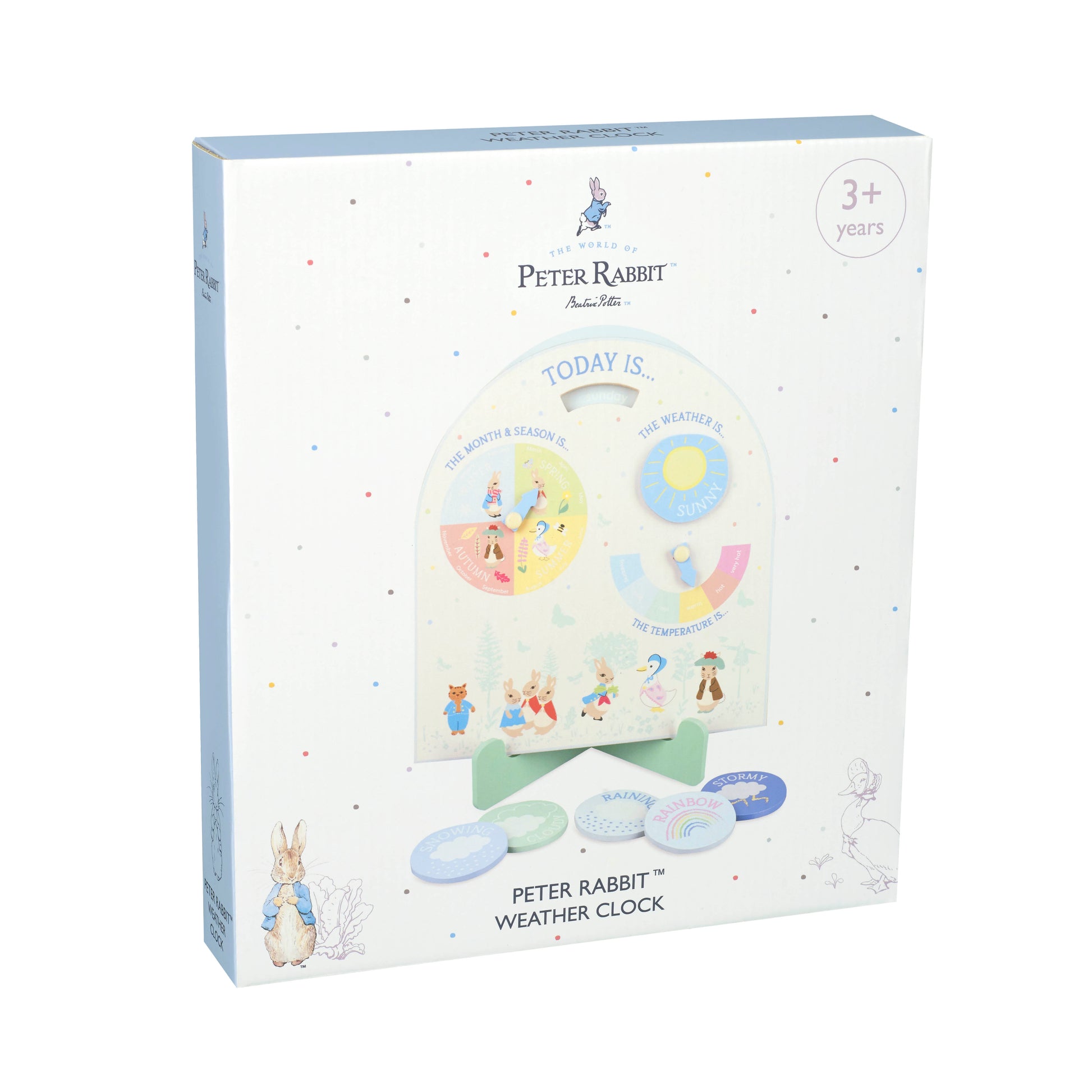 Encourage children to learn about the seasons and the weather with this beautiful wooden Peter Rabbit weather clock. Turn the wheel to select the day of the week, choose the weather from 6 magnetic pieces, and turn the arrows to the season and temperature. Decorated with beautiful Peter Rabbit characters and illustrations, this will look beautiful on a bedroom shelf.