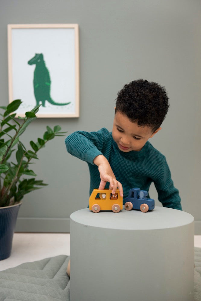 Mr. Crocodile has a cool truck to ride in. Mrs. Elephant and Mr. Fox share a ride in their big yellow bus. Mr. Lion has its own little car to drive around in. Each animal fits in each car, offering many fun ways to play with these 4 animals and 3 cars.