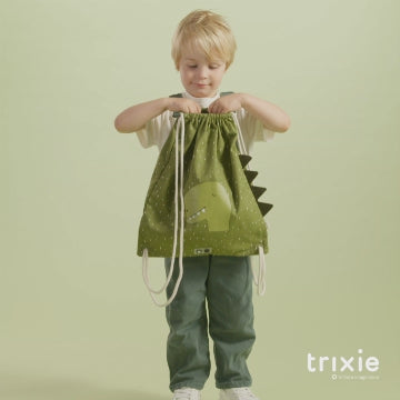 The dino spines provide a nice playful detail. Use the 2 handy drawstrings to easily open and close the gym bag. There are a name tag and a small pocket inside; the latter to keep some small items, money or a membership card.