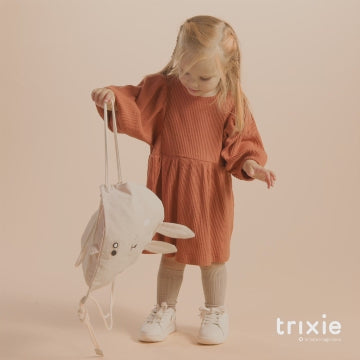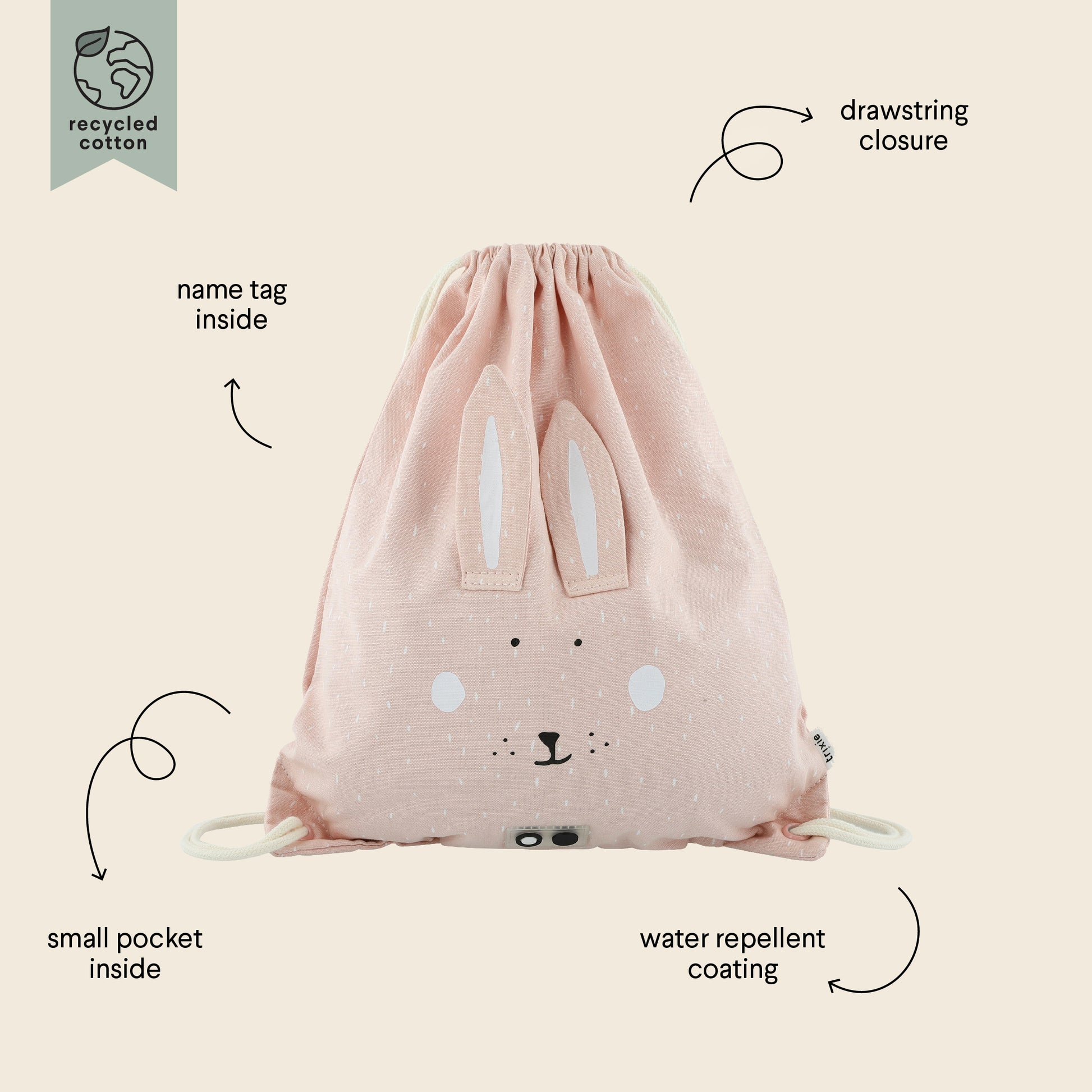 The floppy ears provide a nice playful detail. Use the 2 handy drawstrings to easily open and close the gym bag. There are a name tag and a small pocket inside; the latter to keep some small items, money or a membership card.
